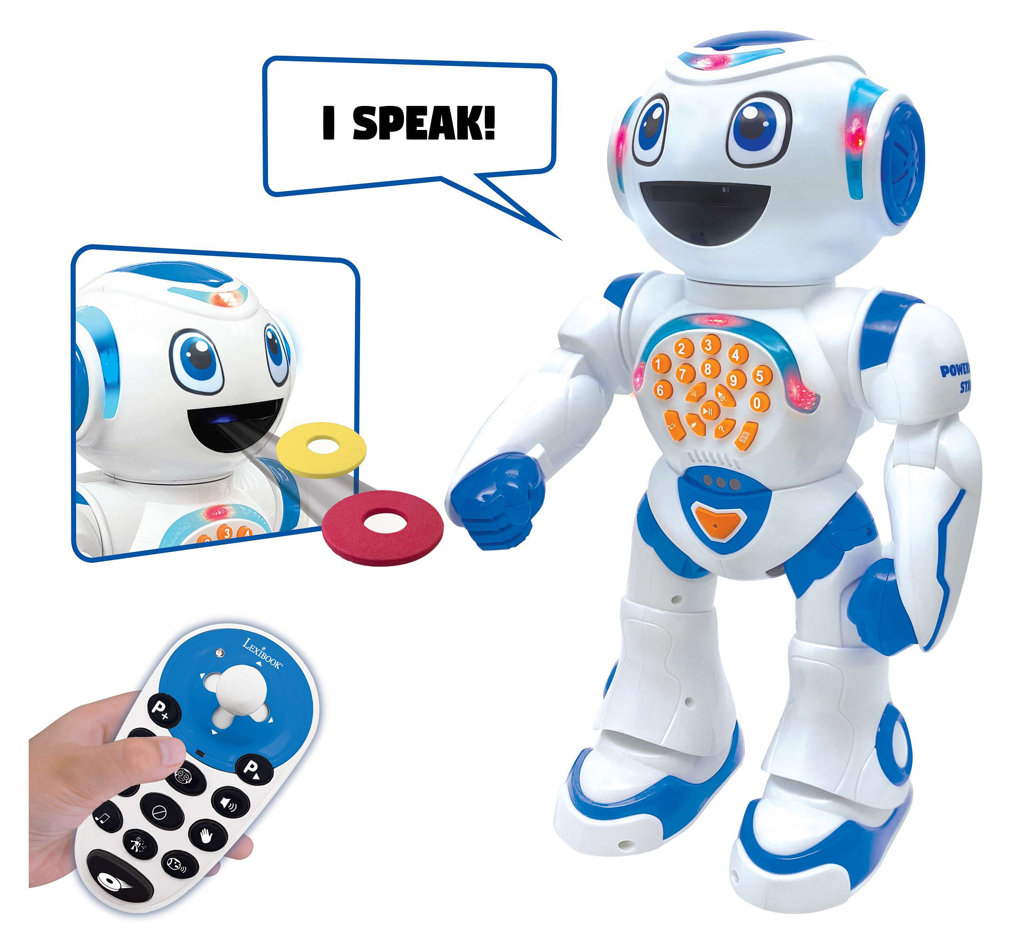 POWERMAN® Star je dalším členem rodiny robotů, který dokáže děti bavit a zároveň vzdělávat. Tento inteligentní mluvící robot vypráví vtipy, Ezopovy bajky a hraje s dětmi vzdělávací kvízy napříč šesti vzdělávacími aktivitami – poznávání čísel, zvířat, každodenního života, hudebních nástrojů a mnohem více – to vše v angličtině! Na otázky stačí odpovědět stisknutím odpovídajícího tlačítka. Díky funkci "story maker" mohou děti vytvořit až 10 000 vlastních příběhů! Robot umí přehrávat hudbu i tančit a s programovací funkcí lze naprogramovat až 40 akcí s možností přidat hudbu a vytvořit si vlastní tance a choreografie, které si robot zapamatuje. Díky funkcím nahrávání a přehrávání dokáže opakovat věty dětí svým robotickým hlasem, který lze upravit efekty. Robota lze kromě dálkového ovládání navigovat gesty, kdy následuje pohyb ruky. A jako zábavný bonus robot střílí barevné pěnové disky.