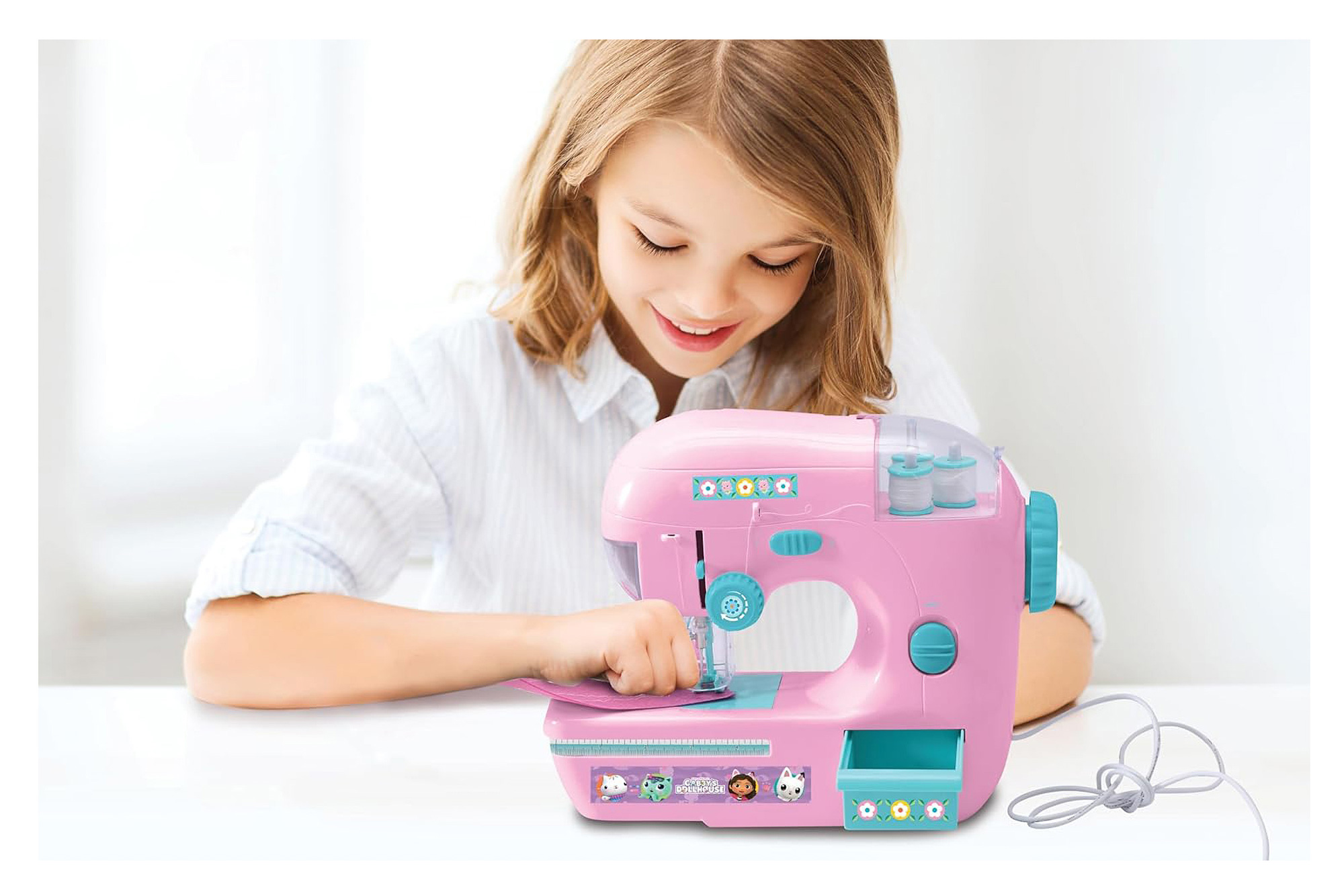 Tento roztomilý šicí stroj se zabudovanou žárovkou umožňuje dětem zkusit si, jaké je to šít oblečení pro panenky nebo pro sebe. Ovládání a nastavení stroje je snadné, přičemž se ovládá pomocí pedálu, stejně jako ten od maminky. Součástí balení je šicí sada uložená v krabičce, která obsahuje nůžky, knoflíky, kousek látky na procvičování, cívky nití, svinovací metr, navlékač jehel a houbičku. Stroj má také plastový ochranný kryt, takže je šití pro děti bezpečné. Stačí navléknout niť, naměřit látku a začít šít!