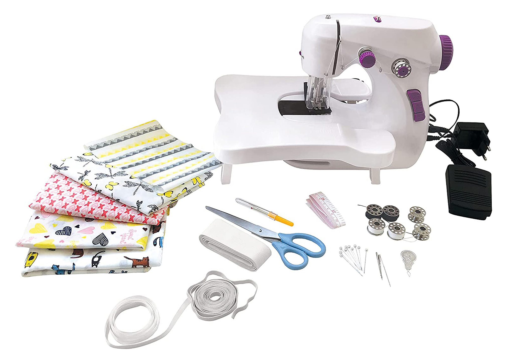 | Obsah balení | 1x šicí stroj, 1x napájecí adaptér, 1x pedál, 1x odnímatelný stolek, 1x šicí sada na 5 výtvorů (nůžky, cívky nití, 5 kusů látky, navlékač jehel, špendlíky, svinovací metr, široká gumička a další) |